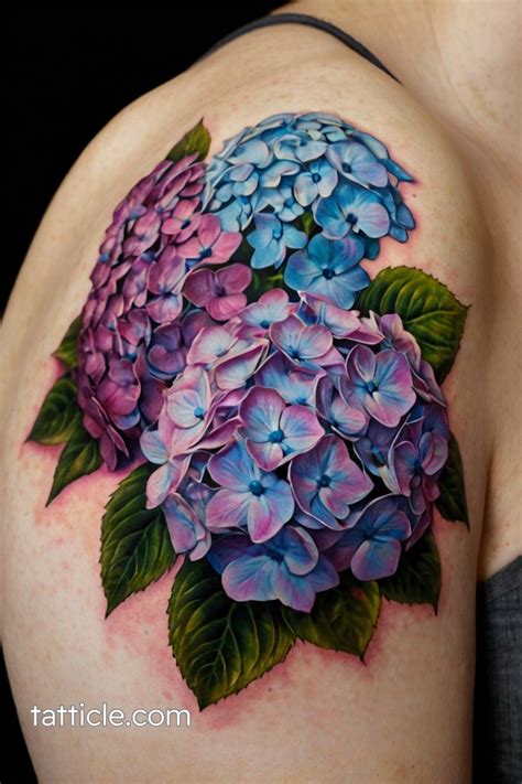 If the tattoo design has pale colors looks tender such tattoo would mean a modesty. You love to ink on your body. The tattoo looks like a photographic image with a combination of purple, green, orange, and black. Which flower is the best tattoo match for your floral inkspiration? Hydrangea flower tattoo ideas 1) realistic hydrangea tattoo design.