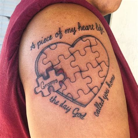 If you want quality piercings or tattoos, come here. A combination of puzzle and word tattoos. The missing heart piece photo: Since a puzzle will not be complete without the other piece, a missing puzzle piece can represent how empty or incomplete you are without a loved one that’s closest to your heart by your side.